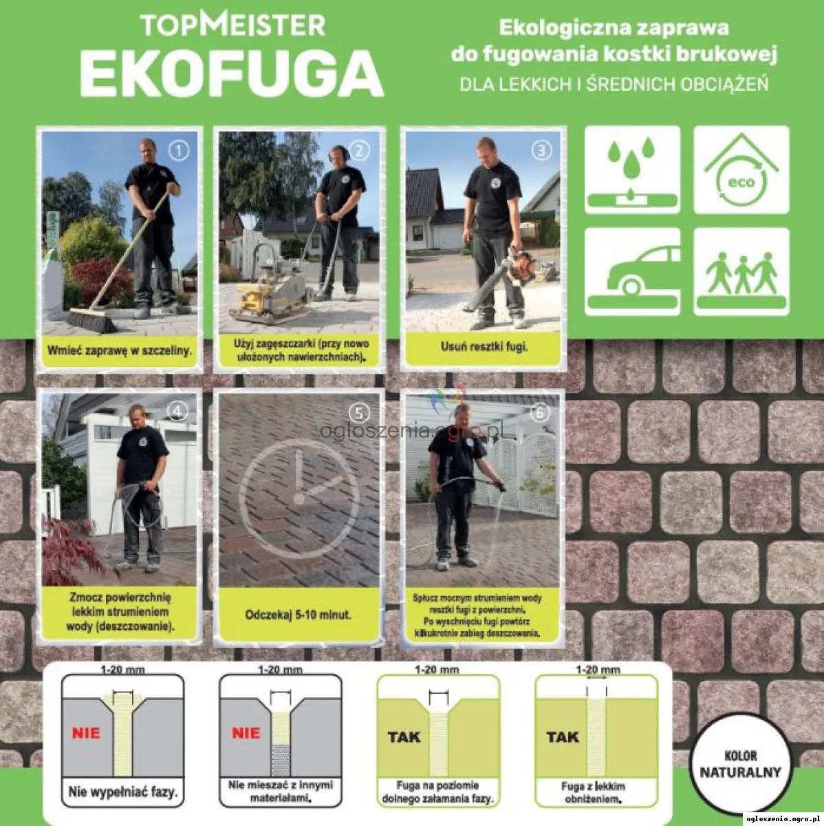 TopMeister Ekofuga kolor naturalny - Jedyna na rynku fuga stosowana „na sucho”. Szczególnie polecana do wąskich szczelin od 1 mm. Gotowa do użycia mieszanka do zasypywania szczelin pomiędzy kostkami brukowymi ze wszelkiego rodzaju materiałów. Twardnieje po odparowaniu wody.