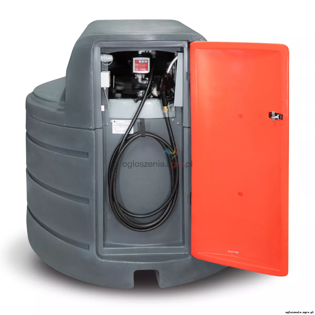 Zbiornik dwupłaszczowy na olej napędowy o pojemności 2500l budka. Zbiornik z dużymi drzwiami do wewnętrznej dystrybucji oraz magazynowania oleju napędowego.